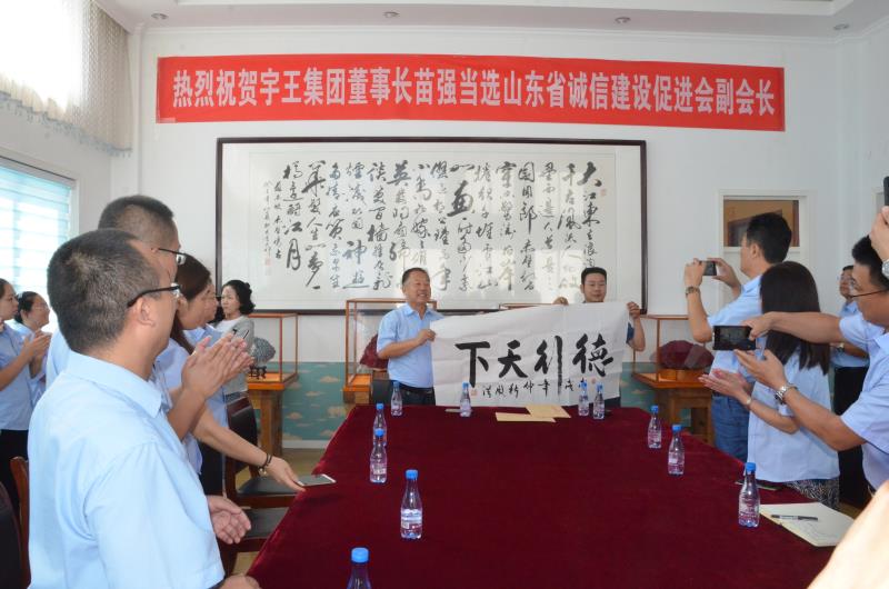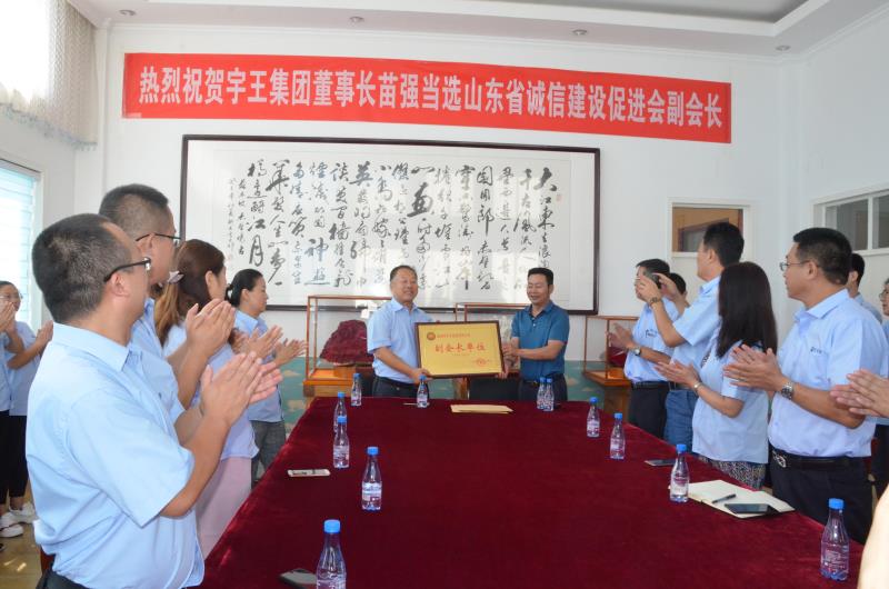 威海市宇王集團榮獲山東省誠信建設促進會副會長單位,宇王集團董事長苗強當選省誠信建設促進會副會長。17上午,在宇王集團會議室進行了授牌儀式。