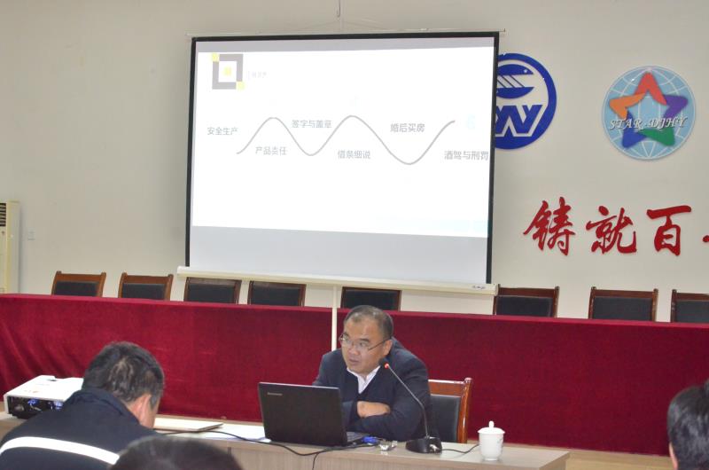 柳律師并沒(méi)有高屋建瓴詳談法律法條,而是結(jié)合企業(yè)發(fā)展實(shí)際情況,從參會(huì)人員的日常工作和生活出發(fā),深入淺出的為大家解答疑惑。在“安全生產(chǎn)、產(chǎn)品責(zé)任、合同簽字蓋章、細(xì)說(shuō)借條、不動(dòng)產(chǎn)歸屬權(quán)、酒駕與刑罰”等六個(gè)分類事項(xiàng)上,通過(guò)身邊大量案例講解,概念闡述,現(xiàn)場(chǎng)互動(dòng)等方式授課。整場(chǎng)內(nèi)容豐富,寓意深刻,易于接受,令所有參訓(xùn)人員感到意猶未盡,受益匪淺。